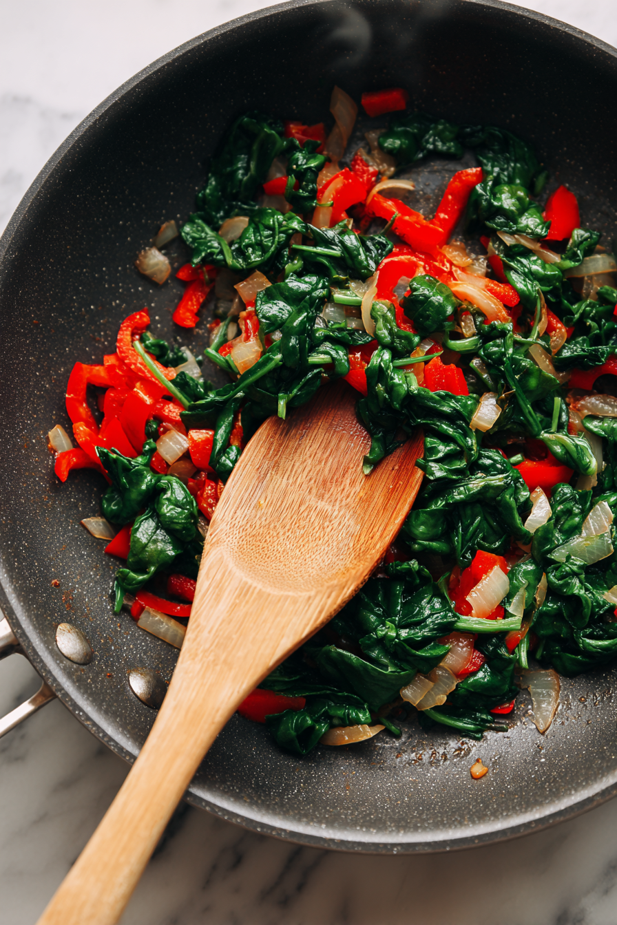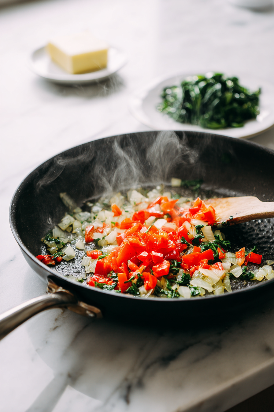 - In a pan, melt a bit of butter. Toss in the onion, cook for 2 minutes. Then, add the bell pepper, give it another minute. Finally, throw in the spinach and let it party for another minute.