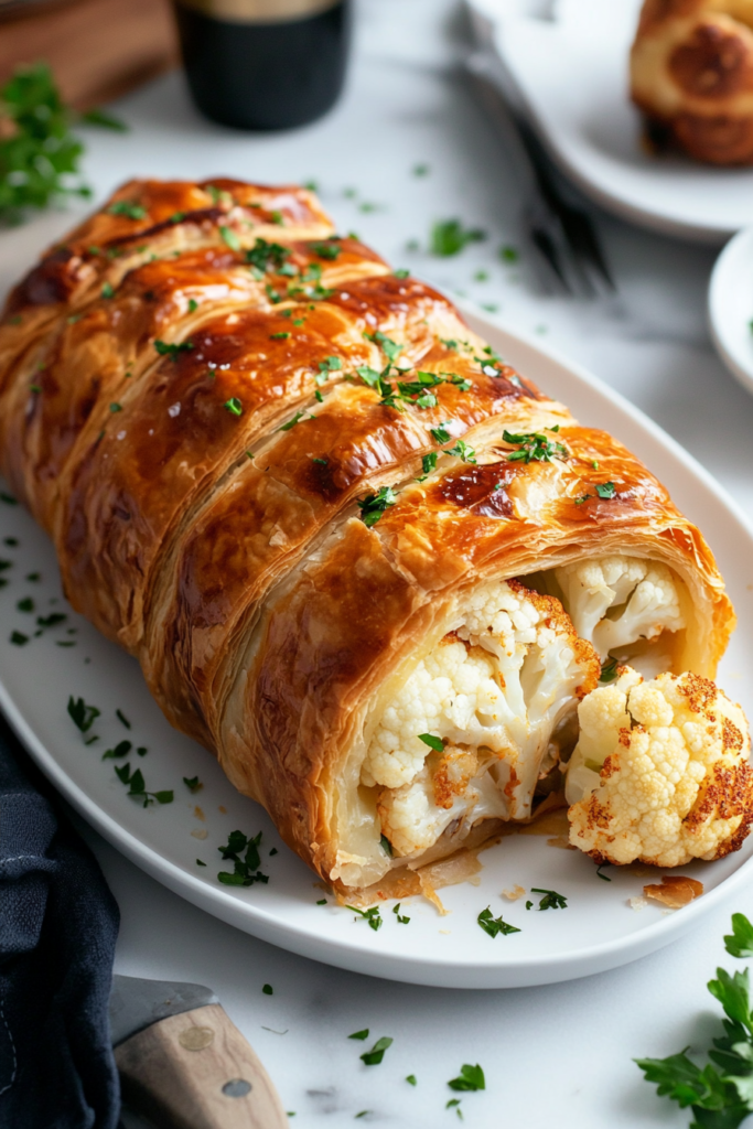 This isn’t just a vegetarian dish—it’s a masterpiece. Cauliflower, roasted until deeply golden, is wrapped in flaky, buttery puff pastry with savory mushroom duxelles that melt in your mouth. It’s a plant-based twist on the classic Beef Wellington, perfect for impressing your Valentine with something unexpectedly elegant.
