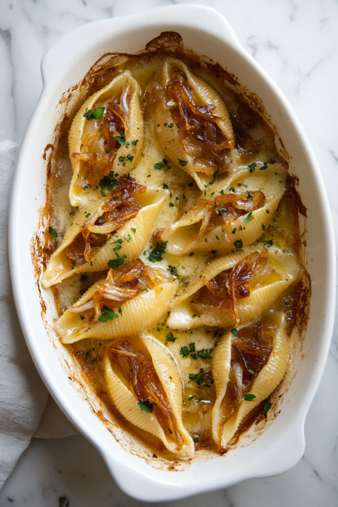 Picture the deep, caramelized richness of French onion soup, but wrapped in tender pasta shells and smothered in a bubbly, golden cheese crust. This dish takes everything you love about that classic bistro favorite—melty Gruyère, slow-cooked onions, a hint of thyme—and transforms it into the ultimate cozy Valentine’s Day lunch.