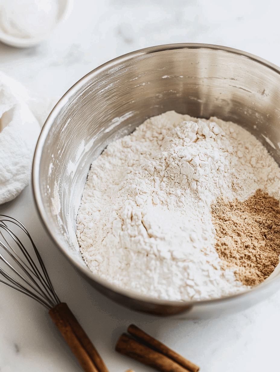 - In a large mixing bowl, whisk together the flour, sugar, baking powder, cinnamon, nutmeg, and salt until well combined.