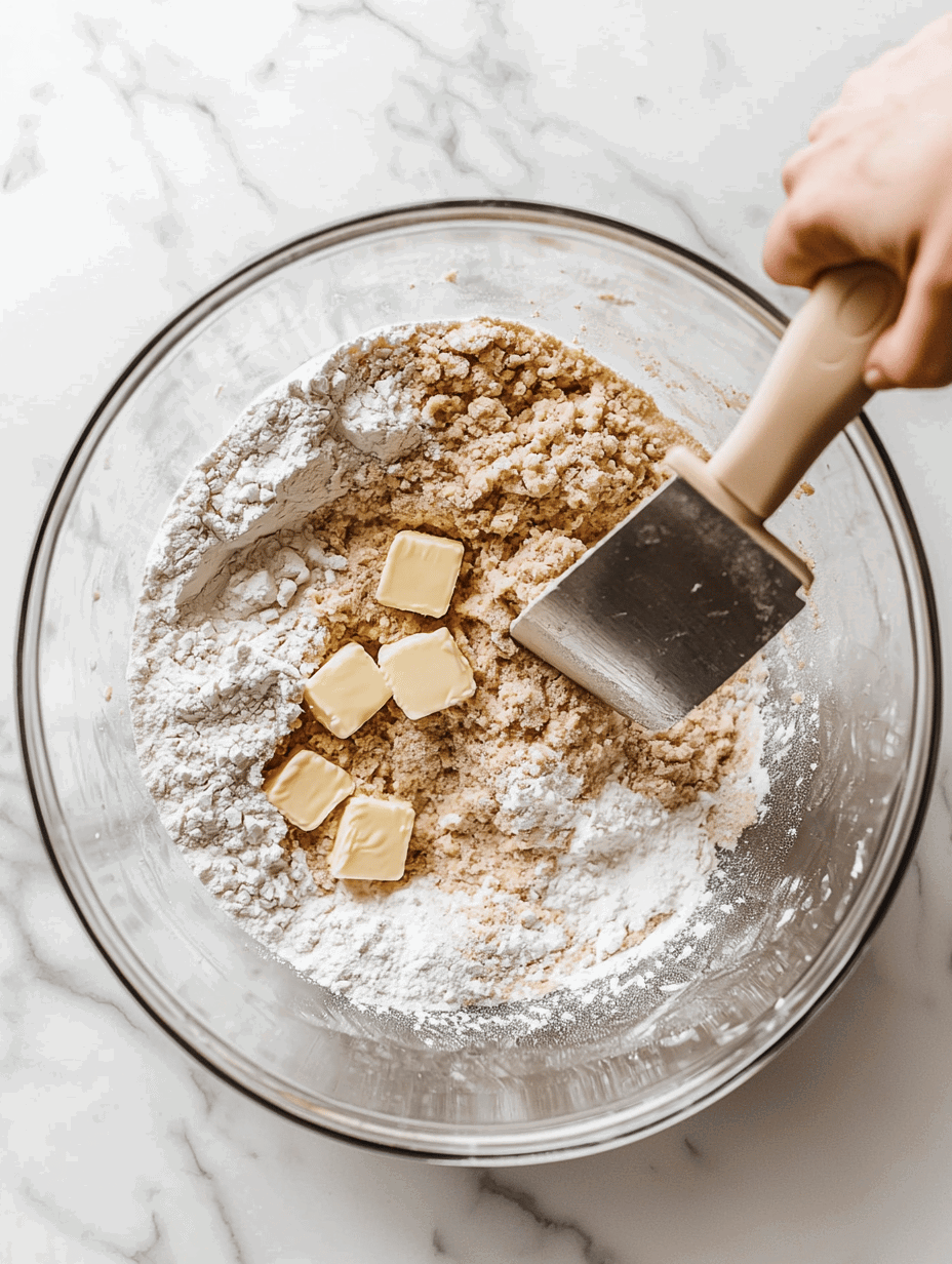 - Add the cold, cubed butter to the dry mixture. Use a pastry cutter or your fingertips to cut the butter into the flour until the mixture resembles coarse crumbs with pea-sized pieces.