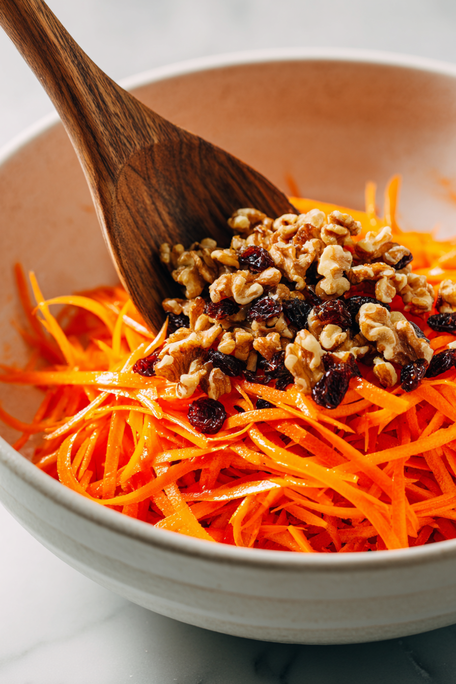 Use firm carrots for best texture and slice them thinly for even coating. Toast walnuts until fragrant but not dark, as they can turn bitter if overdone. If currants feel dry, soaking them briefly improves chewiness — just drain thoroughly before mixing. Warming the olive oil with curry powder helps release aroma. Apple cider vinegar adds brightness, while honey softens sharp edges without making the salad sweet.