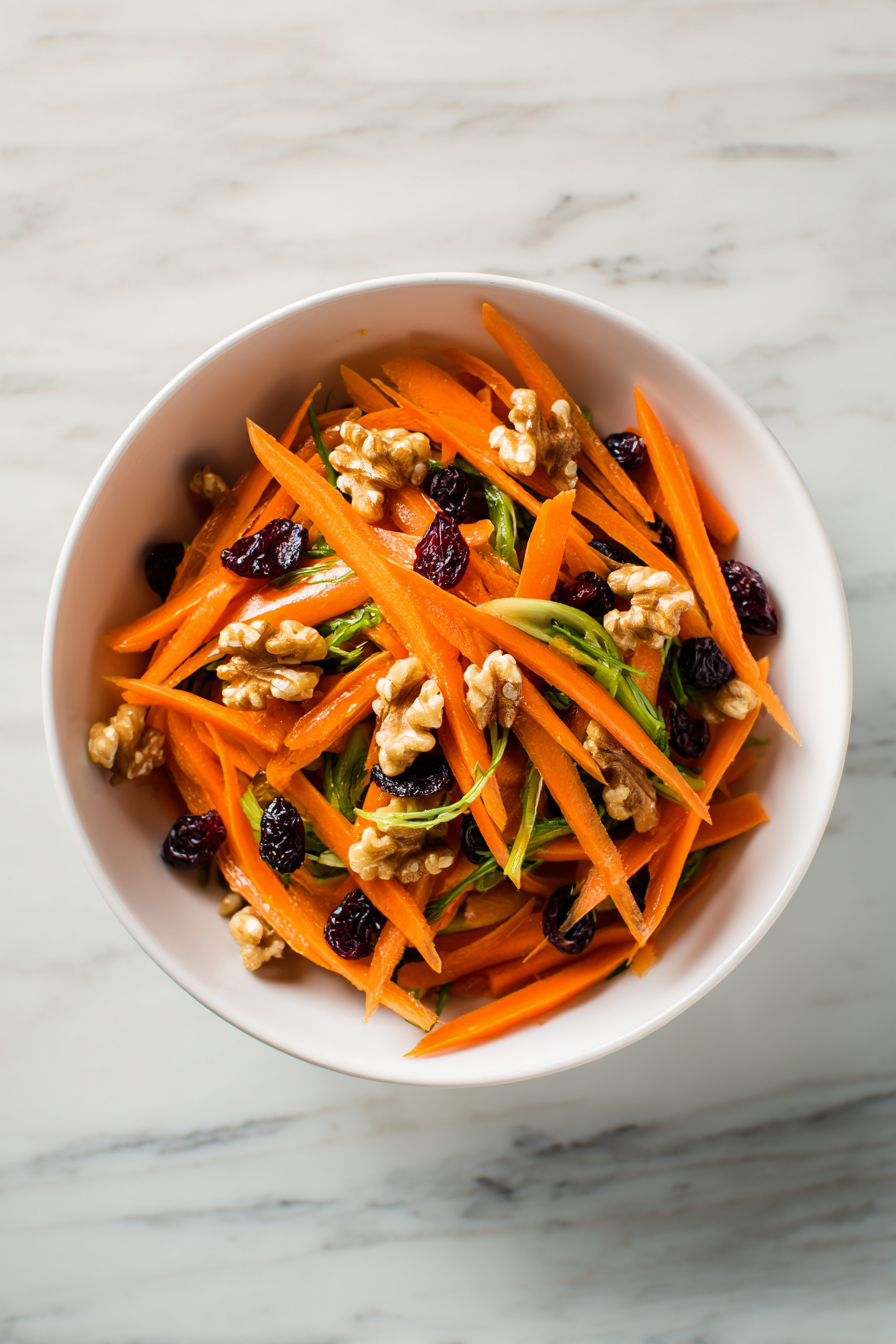 Thinly sliced carrots give the base structure, while toasted walnuts add crunch and dried currants bring small bursts of sweetness. The warm curry-spiced vinaigrette ties everything together without overwhelming the natural flavor of the vegetables.
