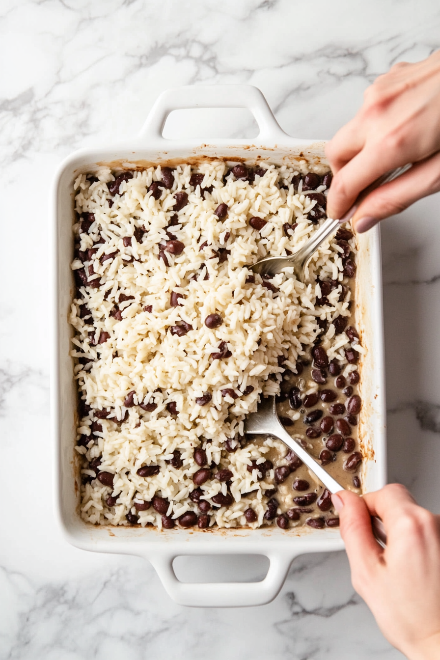 - Spread the seasoning packet in the bottom of the pan, breaking up any lumps with a spoon. Add black beans and rice, then mix well.