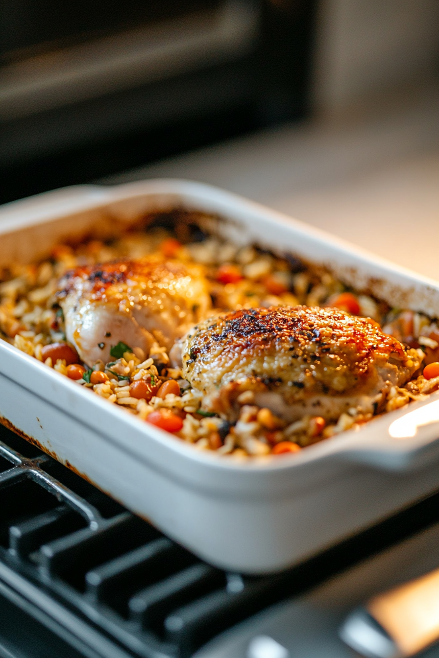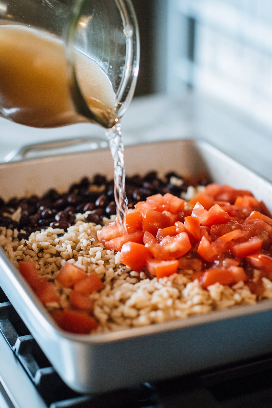 - Place the chicken breast halves on top of the bean and rice mixture and cover the dish tightly with aluminum foil.