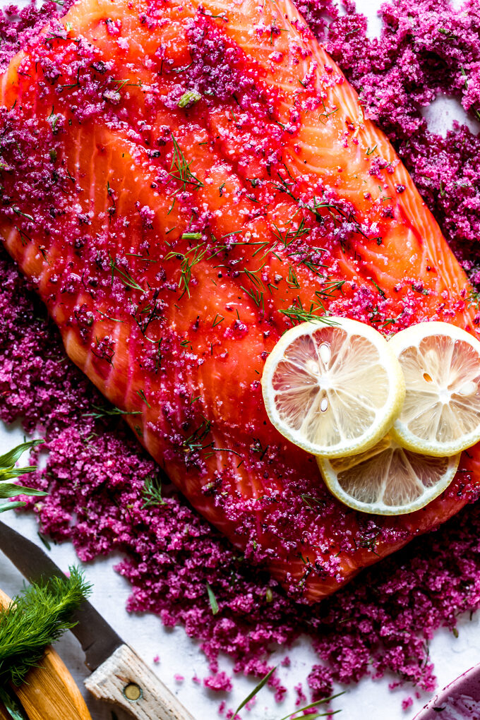 - Layer beet-salt mixture on salmon, wrap tightly in plastic and parchment, then weigh down with baking sheets and weights.