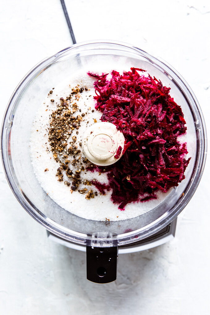 - Grate the raw beet using the biggest holes on a box grater and transfer to a food processor.