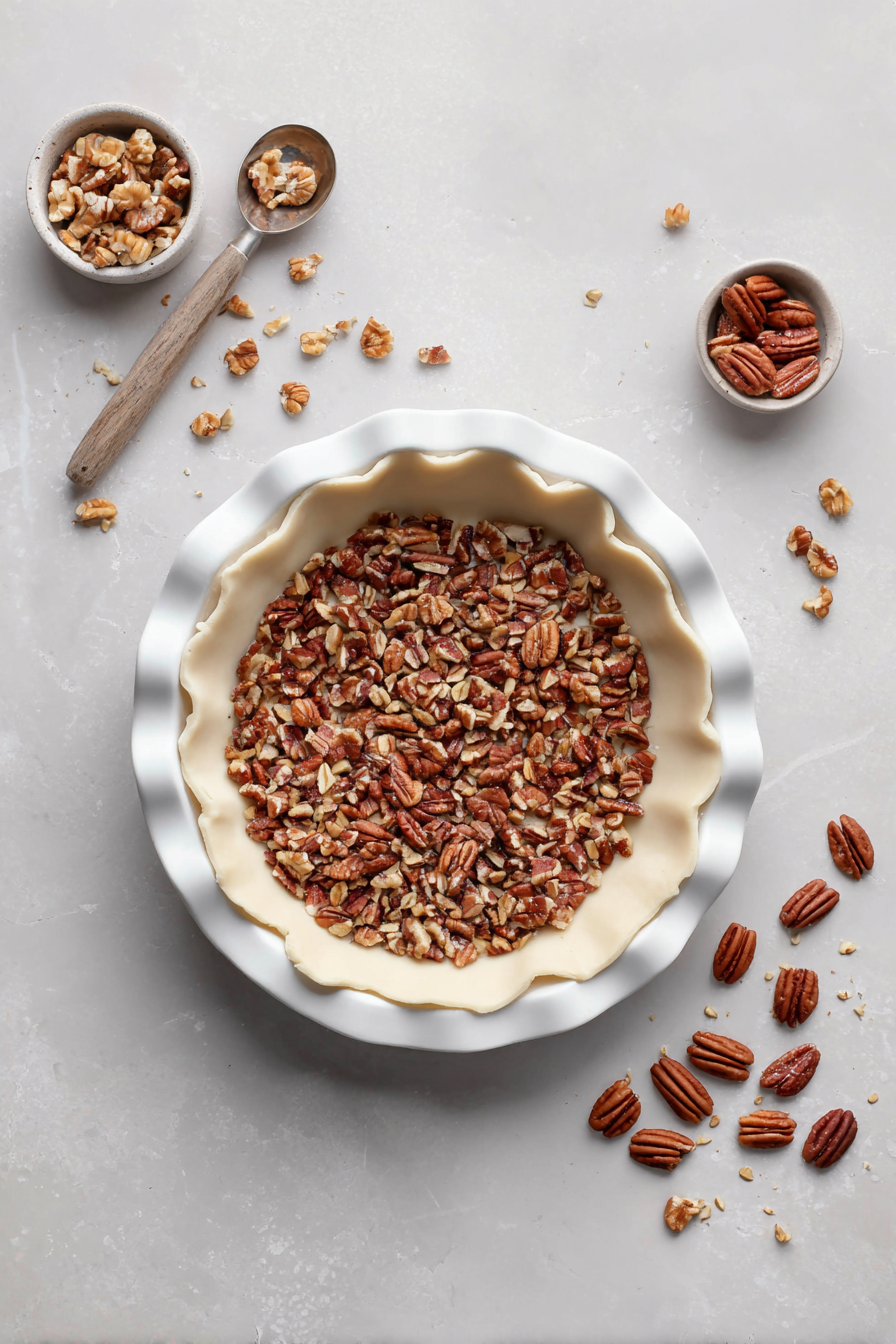 - Roughly chop pecans, leaving some whole for decorating. Spread them evenly into the unbaked pie crust.