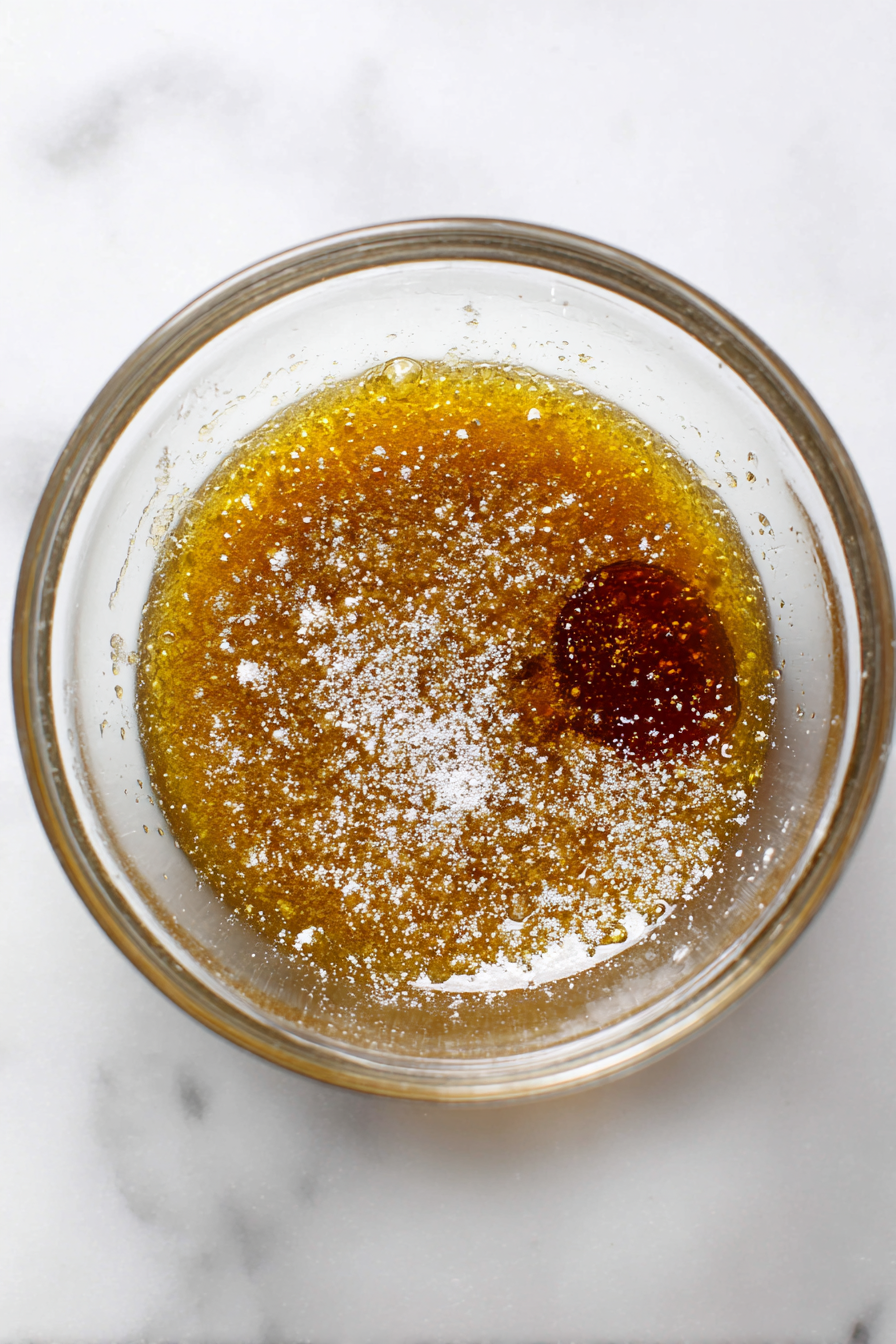 - In a large bowl, combine melted vegan butter, corn syrup, flax eggs, sugar, cornstarch, vanilla, and optional bourbon. Whisk until smooth.
