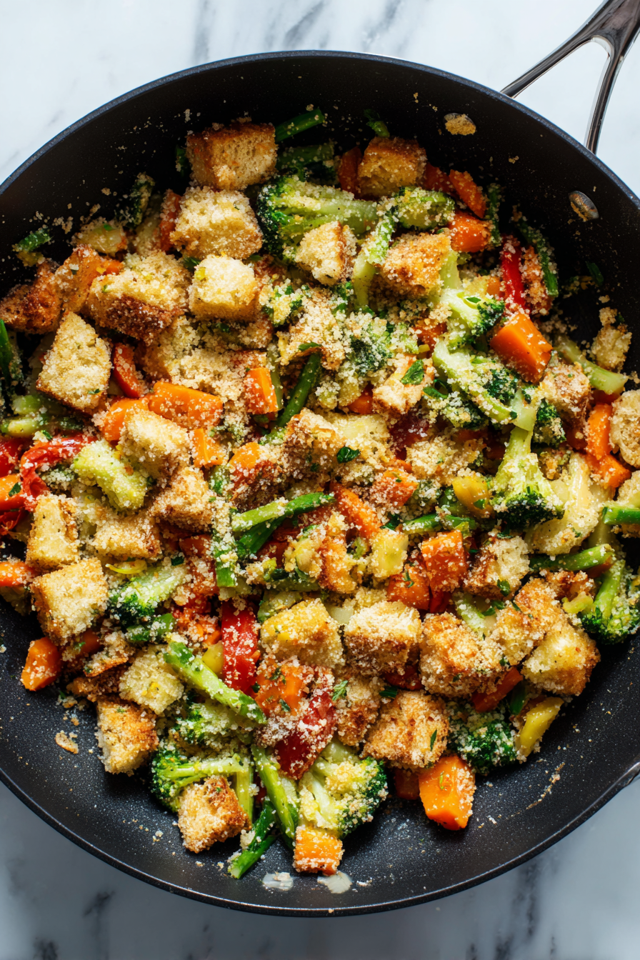 - Stir in the bread crumbs, Parmesan cheese, Pernod (if using), Worcestershire sauce, salt, and pepper into the vegetable mixture. Cook for another 2 minutes. Remove from heat.