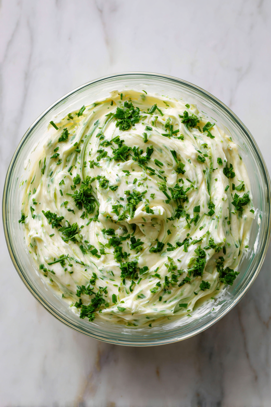 - In a bowl, mix together the mayonnaise, parsley, chives, tarragon, lemon juice, garlic, salt, and pepper. Set aside.