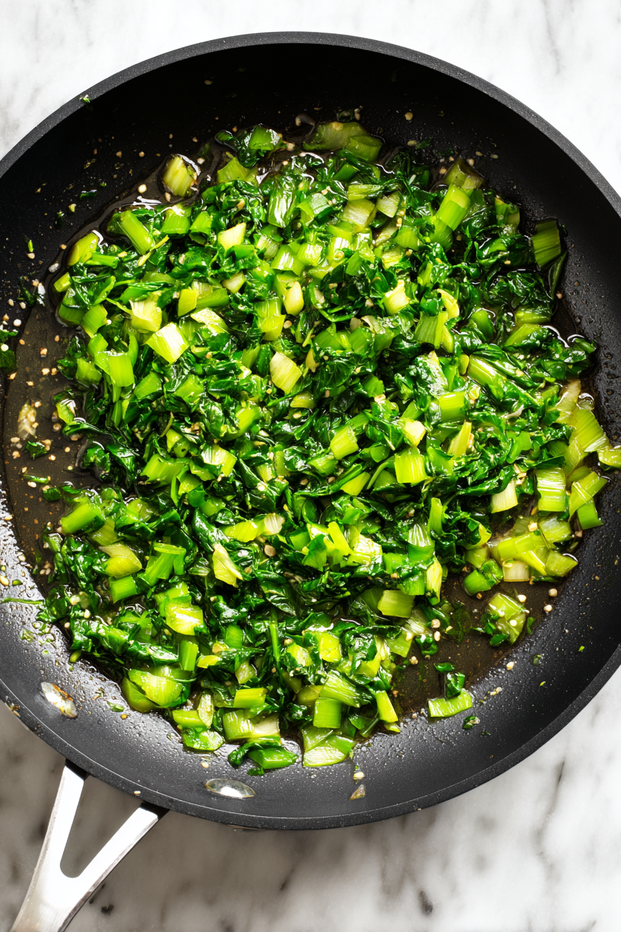 - In a skillet over medium heat, melt the butter. Add the spinach, parsley, green onions, and celery. Cook for about 5 minutes until the vegetables are tender.