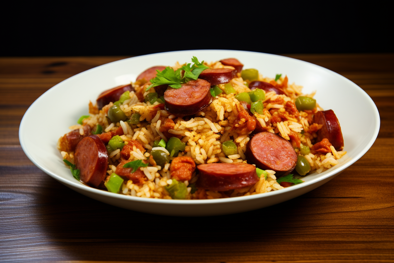 Savor the bold flavors of a Sausage Jambalaya featuring andouille sausage, aromatic spices, and a medley of vegetables, offering a perfect Southern-inspired main course