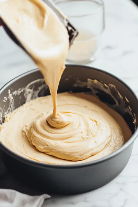Pour the batter into the cake pan, smoothing the top lightly.