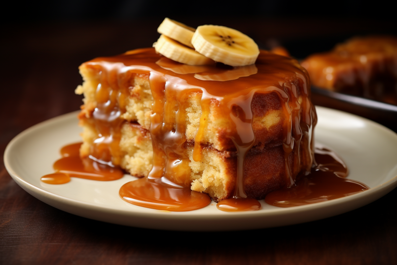 The magic begins with the selection of perfectly ripened bananas, ensuring that their natural sweetness is at its peak. Mashed and folded into the cake batter, these bananas impart a moist and tender crumb, while their subtle tropical notes provide a delightful contrast to the rich caramel undertones. The caramel sauce, a decadent blend of sugar, butter, and cream, is the crowning glory that transforms this dessert into a true masterpiece. As it cascades down the sides of the cake, it forms a golden, gooey embrace that adds an extra layer of indulgence to each slice.