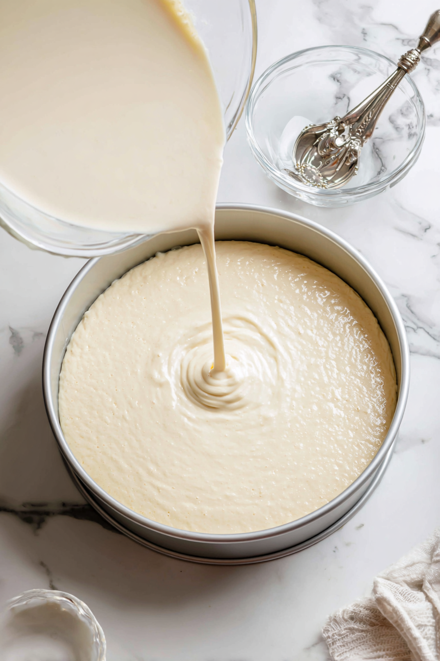 • Pour the batter into the prepared cake pan, spreading it evenly.