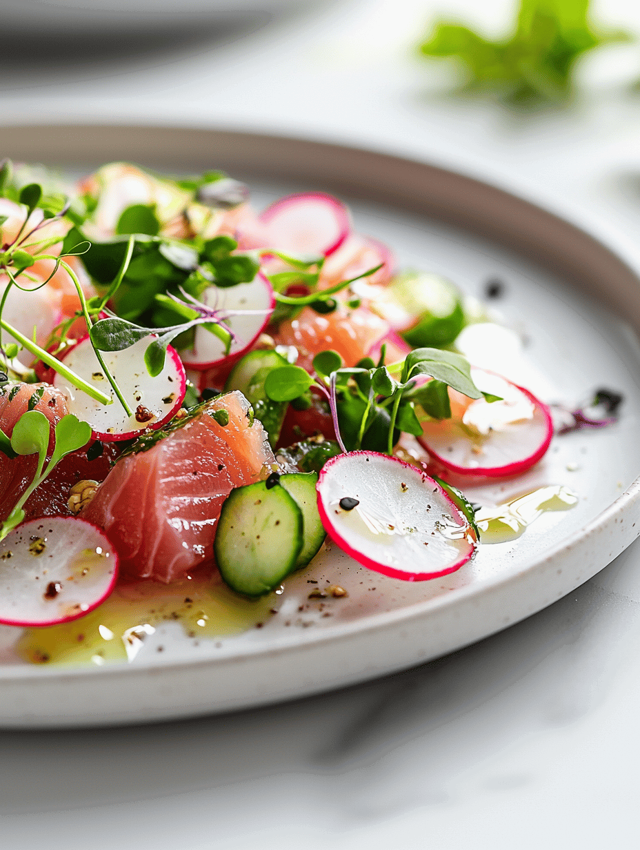 - Squeeze fresh lemon juice over the tuna and radishes, then drizzle with olive oil, creating a fresh, citrusy dressing.