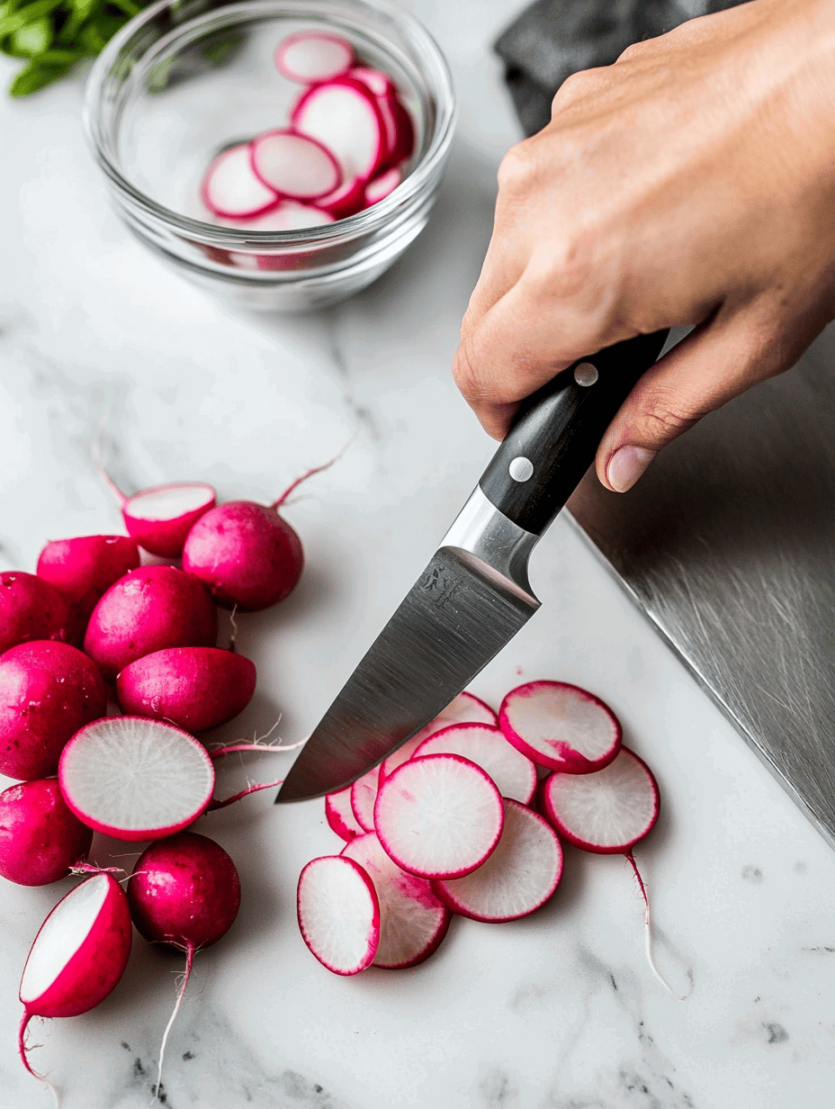 - Trim and thinly slice the radishes on a cutting board, revealing their peppery, crisp interior.