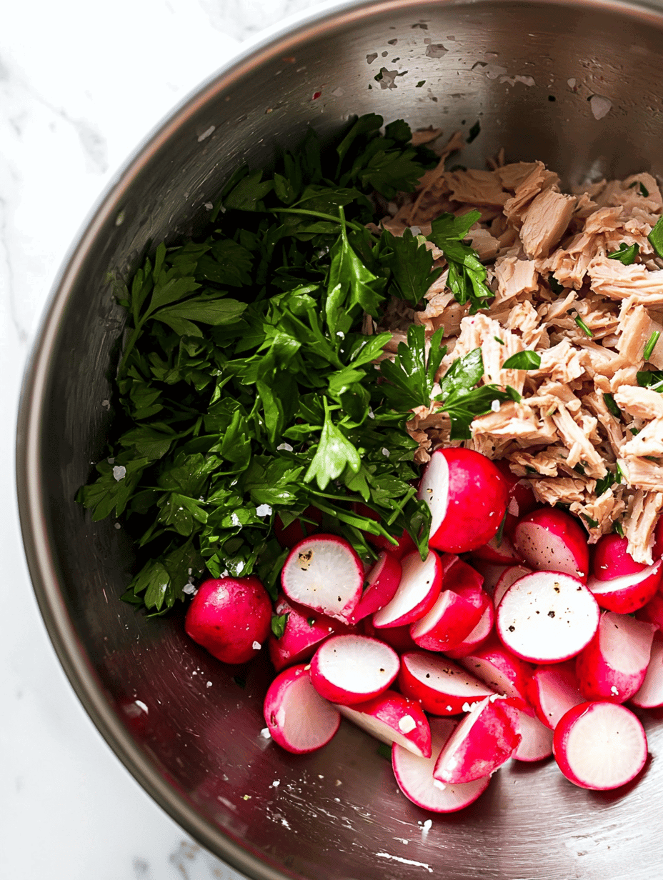 - Add the sliced radishes to the bowl with the tuna and give everything a gentle stir to combine the flavors.