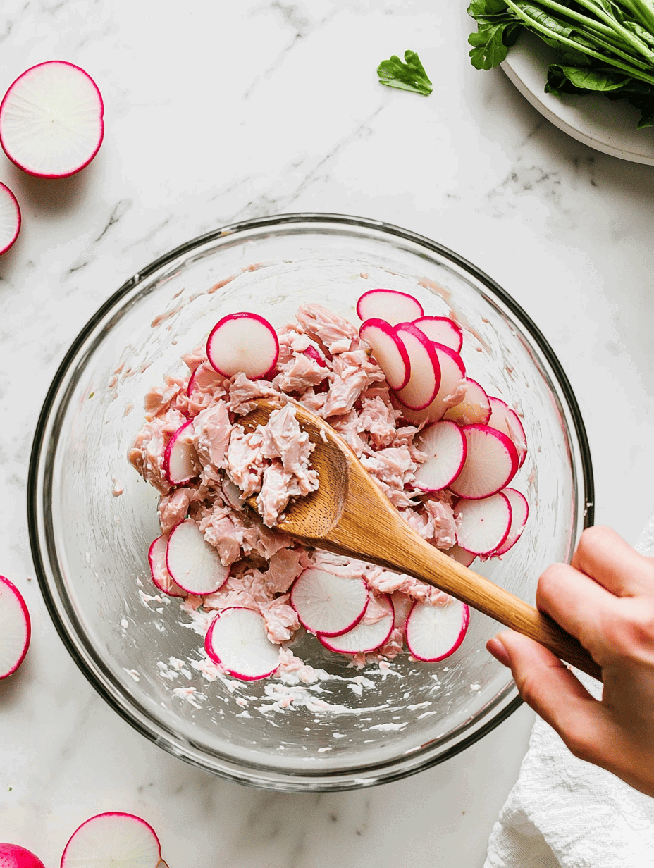 - Add the sliced radishes to the bowl with the tuna and give everything a gentle stir to combine the flavors.