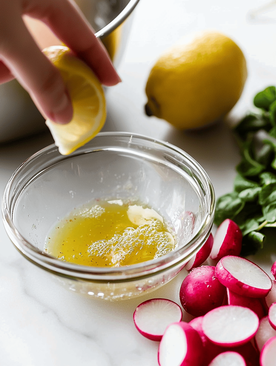 - Squeeze fresh lemon juice over the tuna and radishes, then drizzle with olive oil, creating a fresh, citrusy dressing.