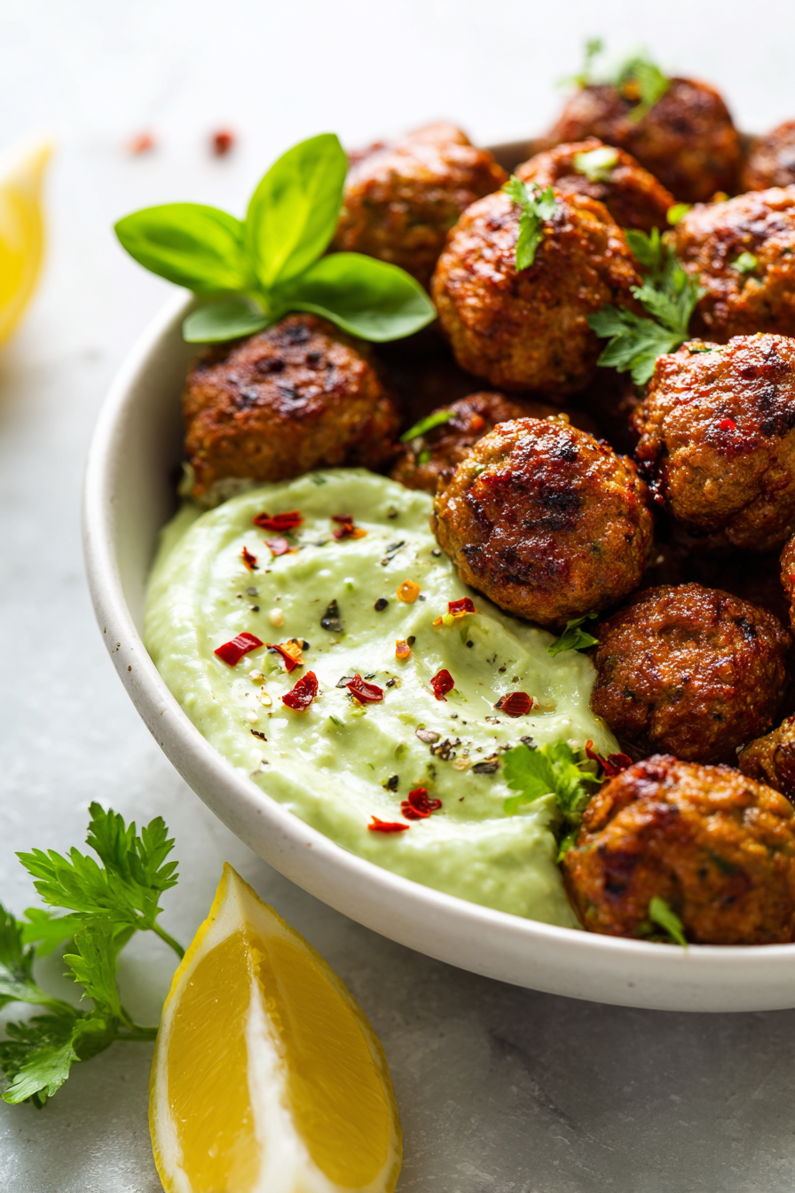 - Step 7: Assemble and ServeArrange the meatballs on a plate or shallow serving bowl.Spoon or drizzle the Green Goddess Dip on the side.Garnish with fresh herbs, chili flakes, or a squeeze of lemon for brightness.Serve immediately while the meatballs are still warm and juicy.