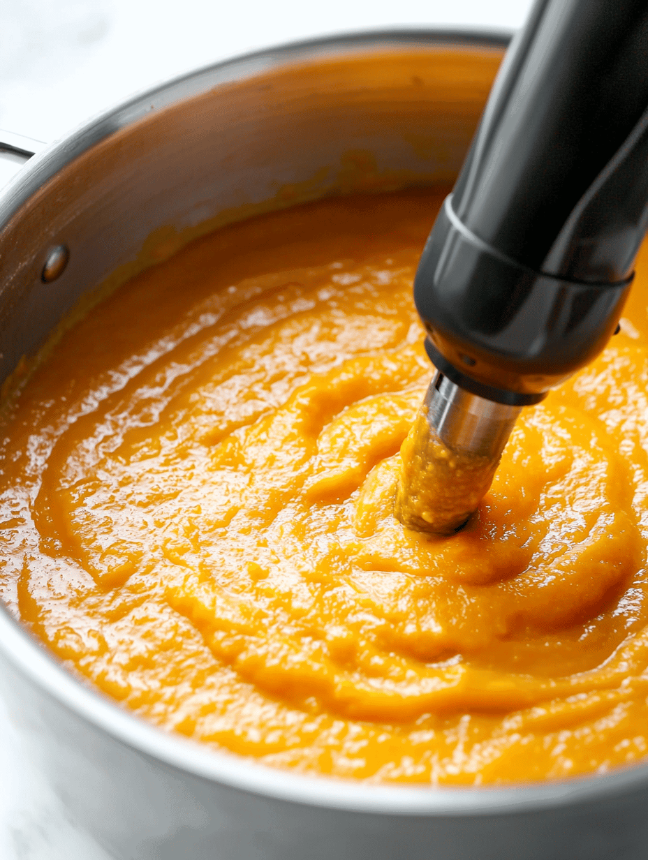 - Use an immersion blender or transfer the soup in batches to a blender. Puree until smooth and creamy, creating a velvety texture that coats the back of a spoon.