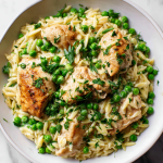 Chicken orzo with peas is a flavorful, one-pot dish that combines juicy chicken thighs, tender orzo, and fresh peas, all brought together in a savory broth. The dish is finished with a squeeze of fresh lemon juice and a sprinkle of parsley, making it feel bright and satisfying. I often find myself preparing this meal …
