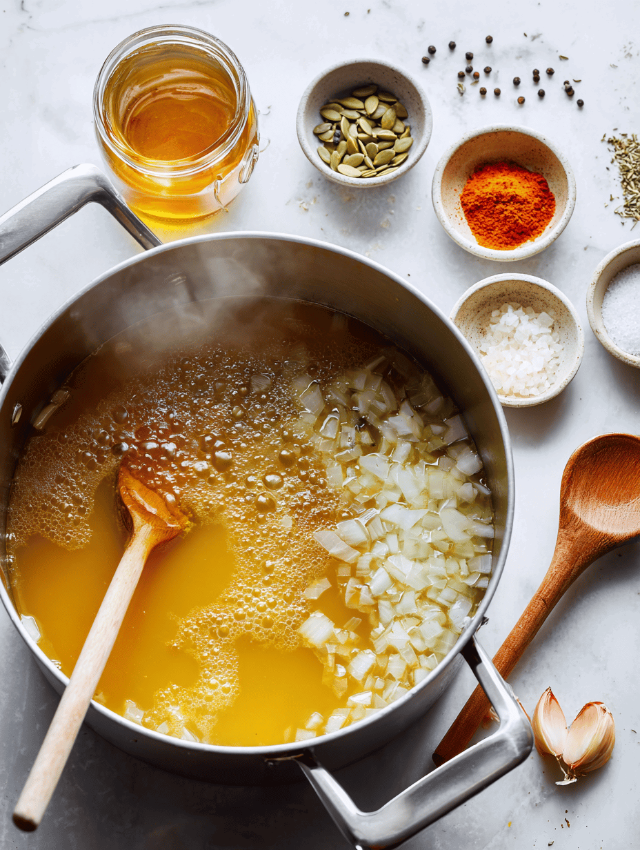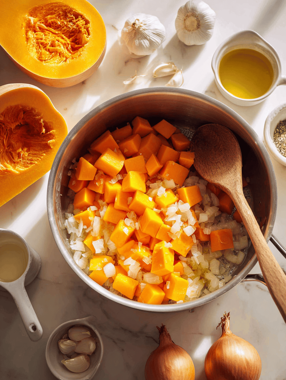 Step 5: While the squash roasts, sauté diced onion and garlic in a large pot until translucent, about 5 minutes.