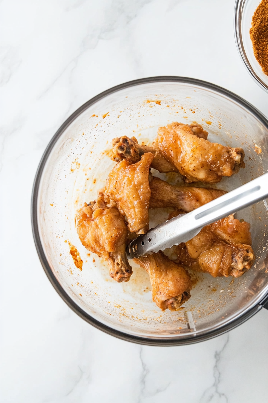 Top-down image of golden chicken wings halfway cooked in an air fryer basket, with a hand using silver tongs to flip them. The air fryer sits on a white marble countertop. The wings are turning crisp and golden. The glass bowl with seasoning residue and used tongs show active preparation during the cooking process.