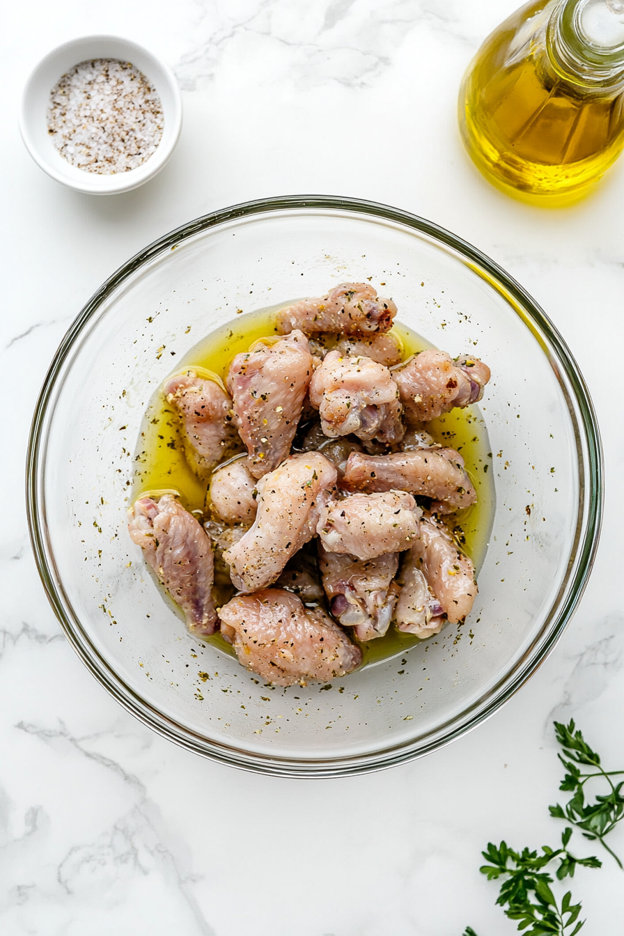 A clean top-down photo showing chicken wings in a transparent glass mixing bowl tossed with golden olive oil, garlic salt, and lemon pepper. The wings glisten slightly as they're coated with the seasonings. The setup includes a small white bowl of remaining spices and a bottle of olive oil on the white marble countertop.
