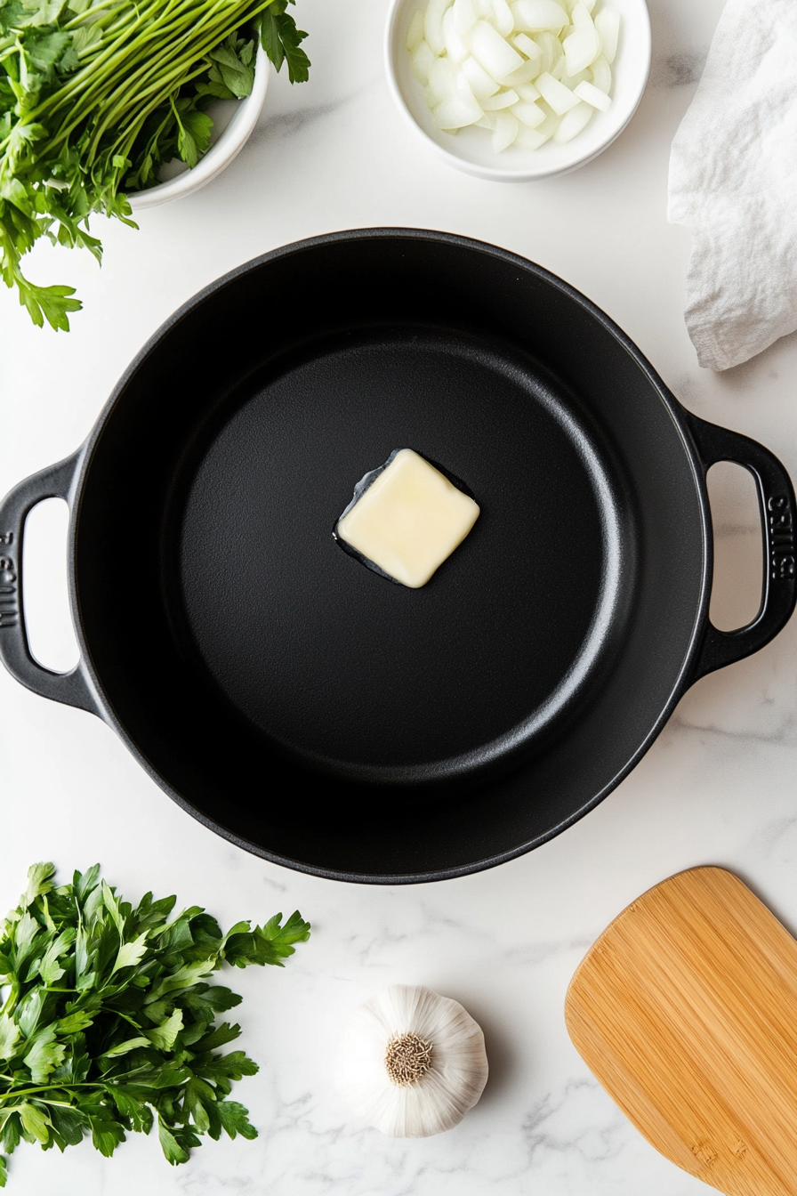 - Heat butter and oil in a large pot, then sauté onions until golden.