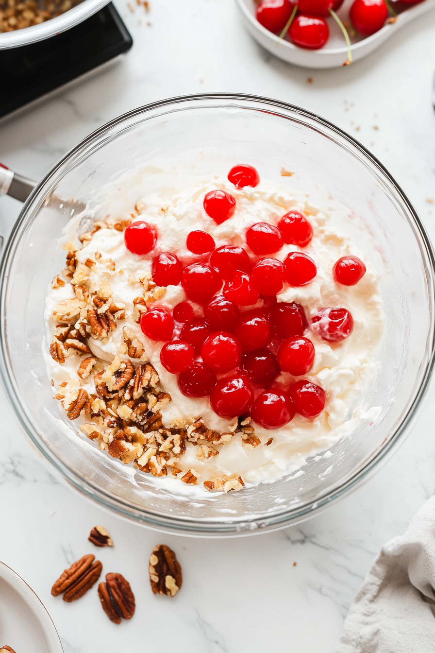 • Gently fold in maraschino cherries and chopped pecans if using.