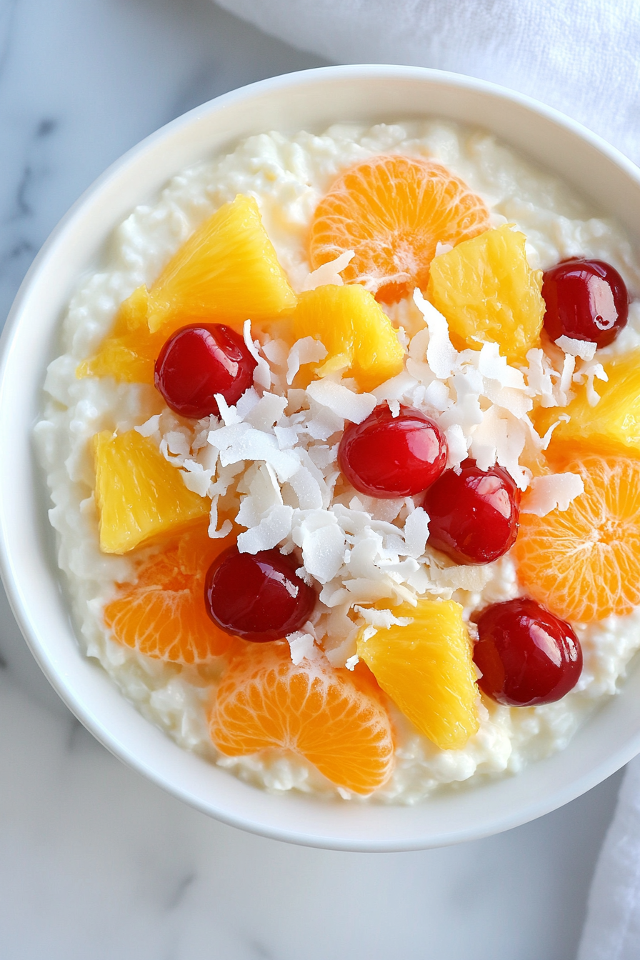 What makes Ambrosia Salad stand out is how simple yet incredibly satisfying it is. The marriage of juicy fruits like mandarin oranges, pineapple, and maraschino cherries, with the creamy base of whipped cream and sour cream, creates the perfect balance of flavors.