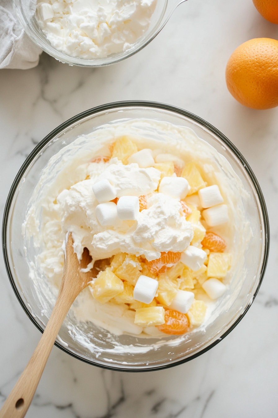 • In a large bowl, combine pineapple chunks, mandarin oranges, mini marshmallows, shredded coconut, sour cream, and whipped topping. Mix gently until well combined.