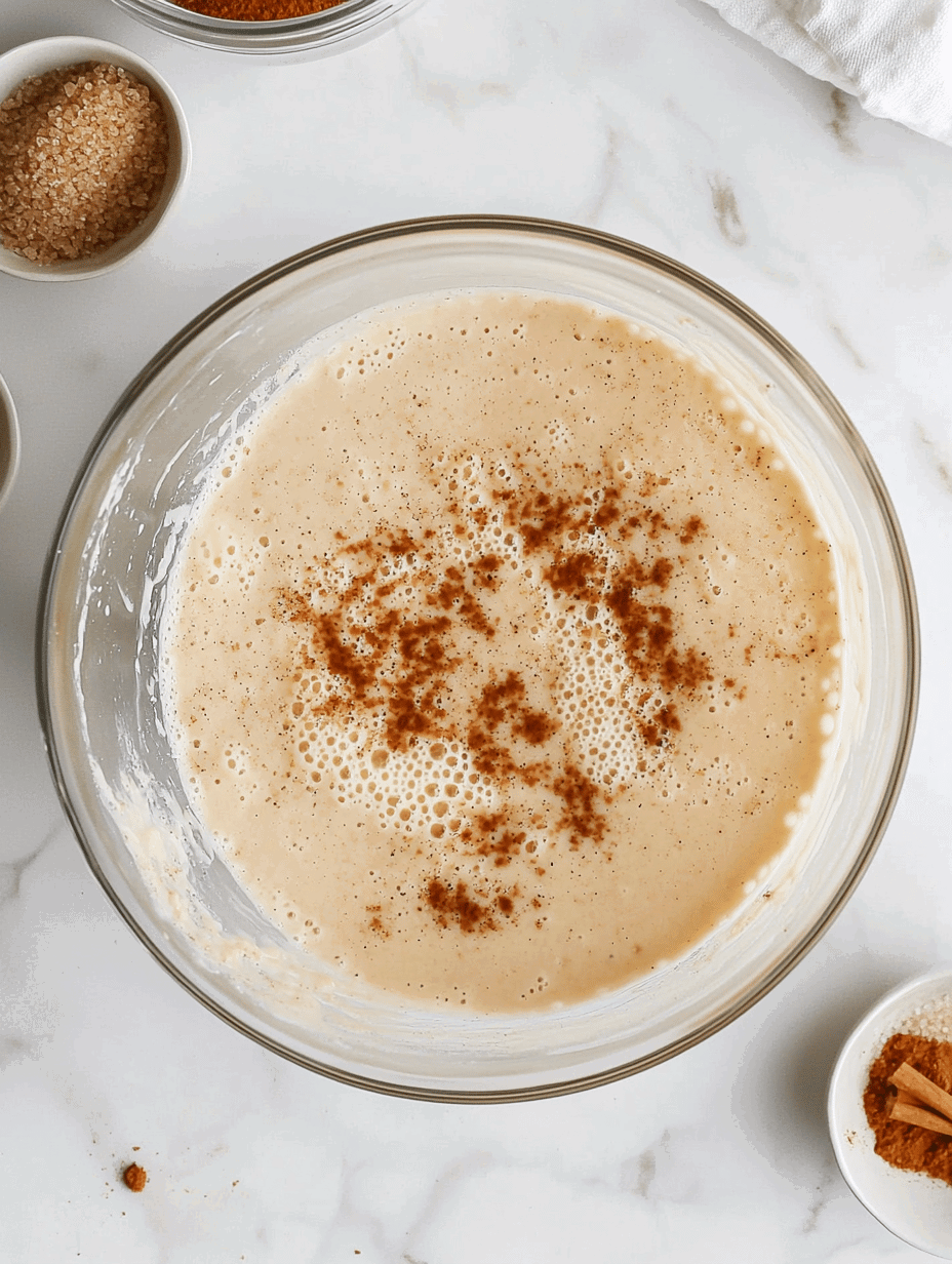- In a large mixing bowl, whisk together eggs, milk, vanilla extract, ground cinnamon, and brown sugar until smooth and well combined. The mixture should be slightly frothy and fragrant with cinnamon.