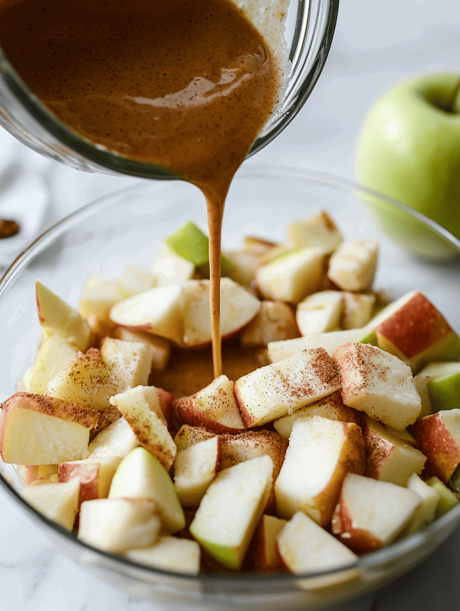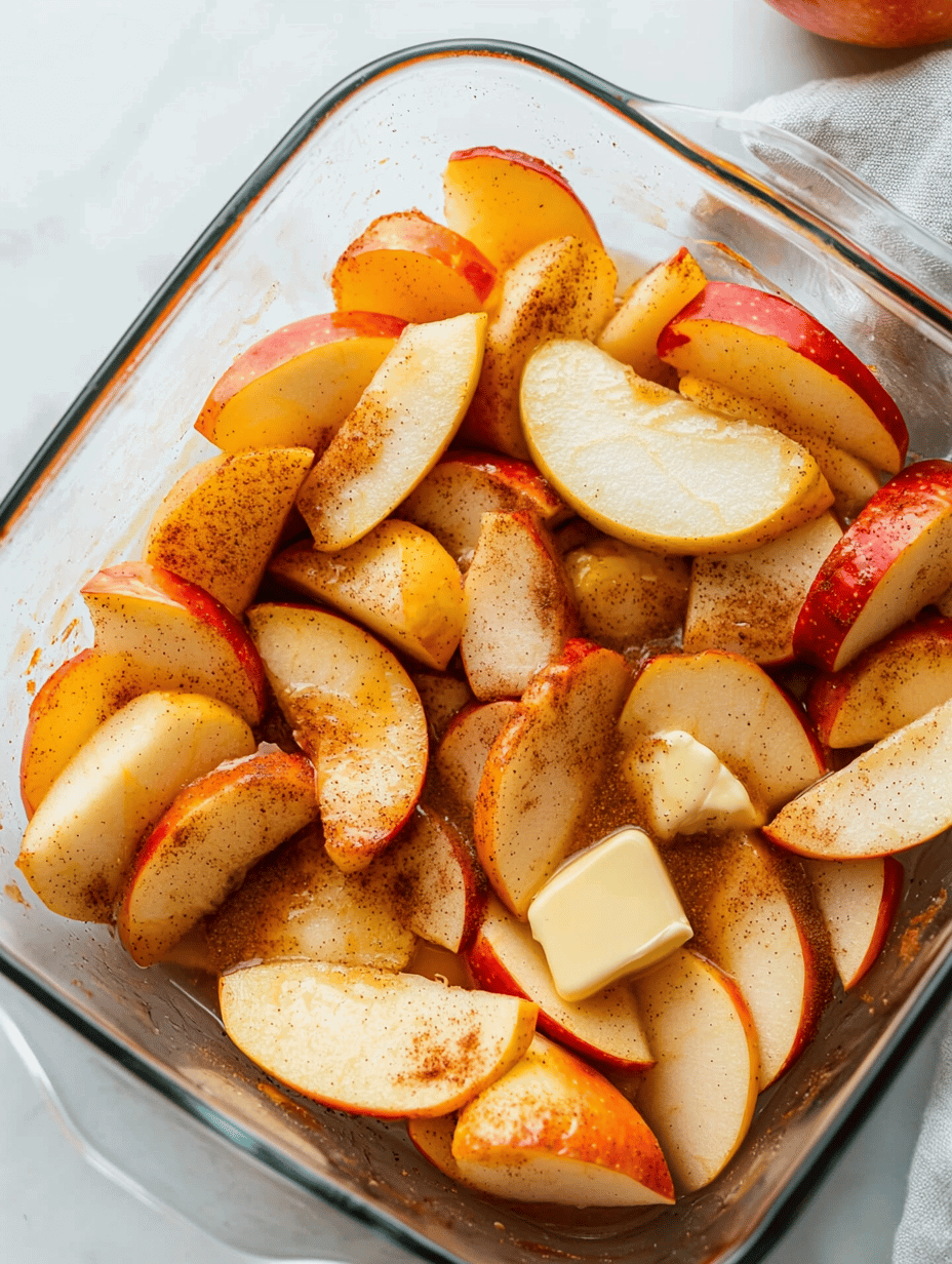 - Meanwhile, toss the sliced apples with a tablespoon of melted butter and a teaspoon of cinnamon, coating them evenly. Spread the apples in the bottom of the prepared baking dish, creating a single layer.