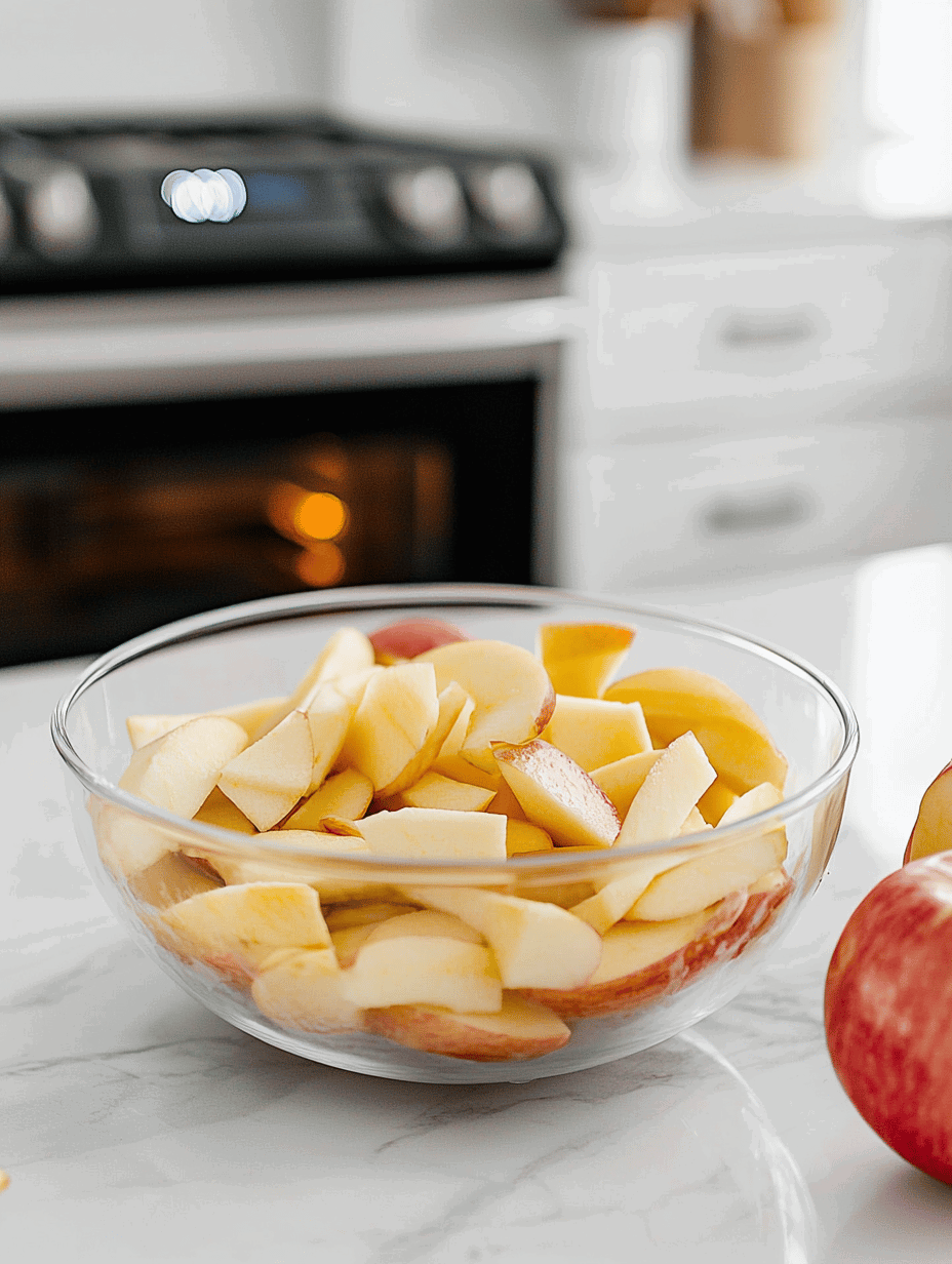 - Preheat your oven to 375°F (190°C). Gather your peeled, sliced apples and place them in a large mixing bowl.