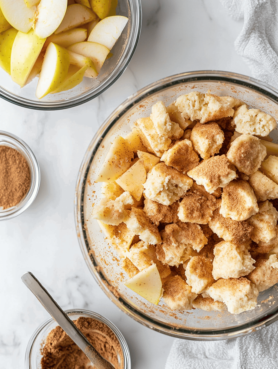 - Tear the biscuit dough into rough chunks and layer them over the apples, distributing evenly across the dish.