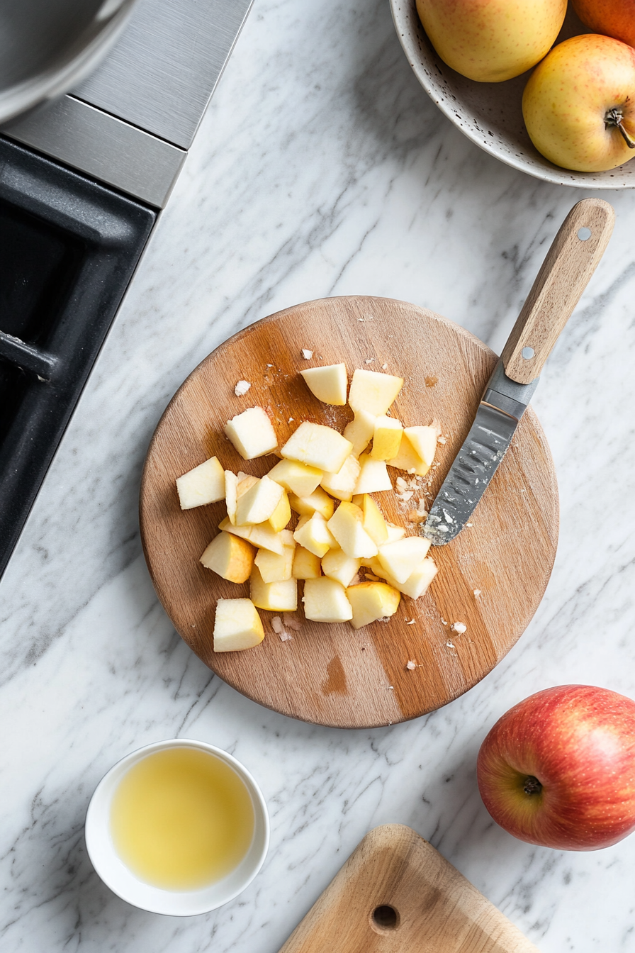 - Core, peel, and chop apples into ½” cubes, tossing them in lemon juice to prevent browning.