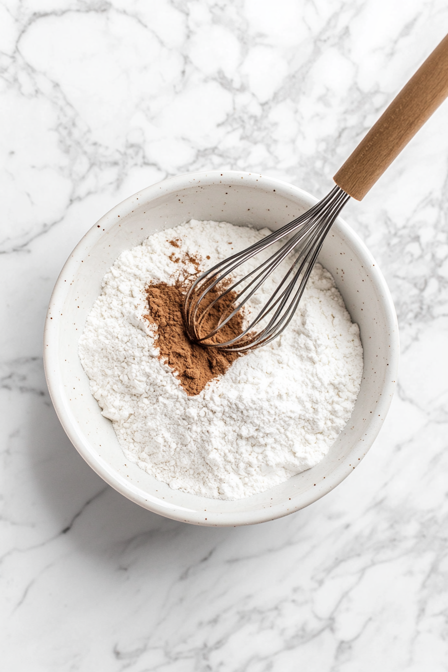 - Whisk together flour, baking powder, salt, and cinnamon in a small bowl.