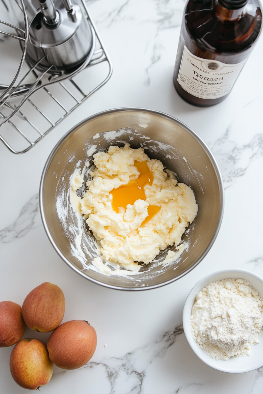 - Cream butter and sugar in a stand mixer until light and fluffy, then add eggs one at a time, mixing well.