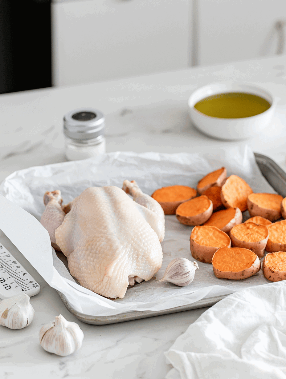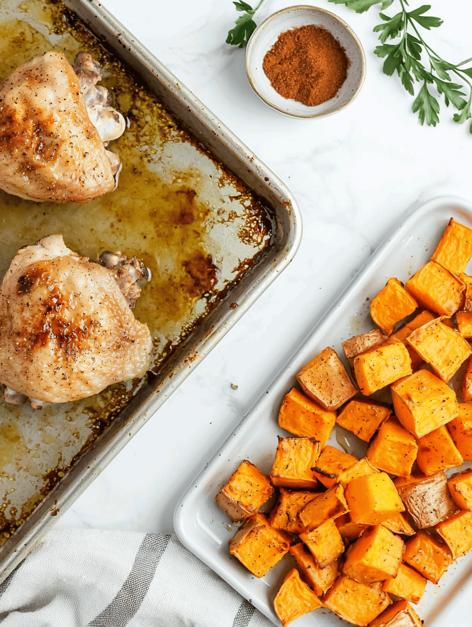 - Arrange the seasoned chicken thighs on one side of the prepared baking sheet, skin side up, and spread the sweet potato chunks on the other side in a single layer.