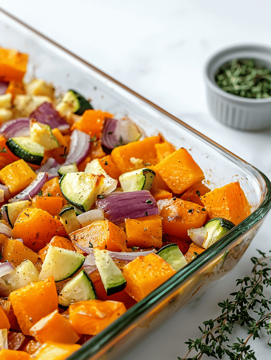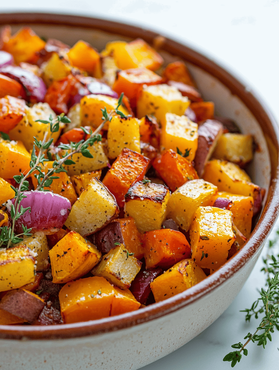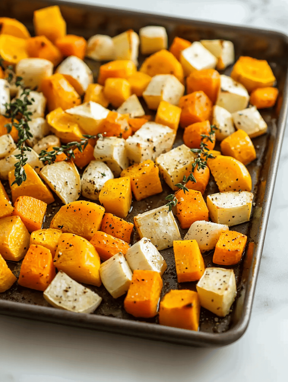 - Preheat your oven to 400°F (200°C). Cut the squash, carrots, and parsnips into small cubes, then toss them with olive oil, thyme, minced garlic, salt, and pepper on a baking sheet. Roast for about 25-30 minutes until vegetables are tender and slightly caramelized.