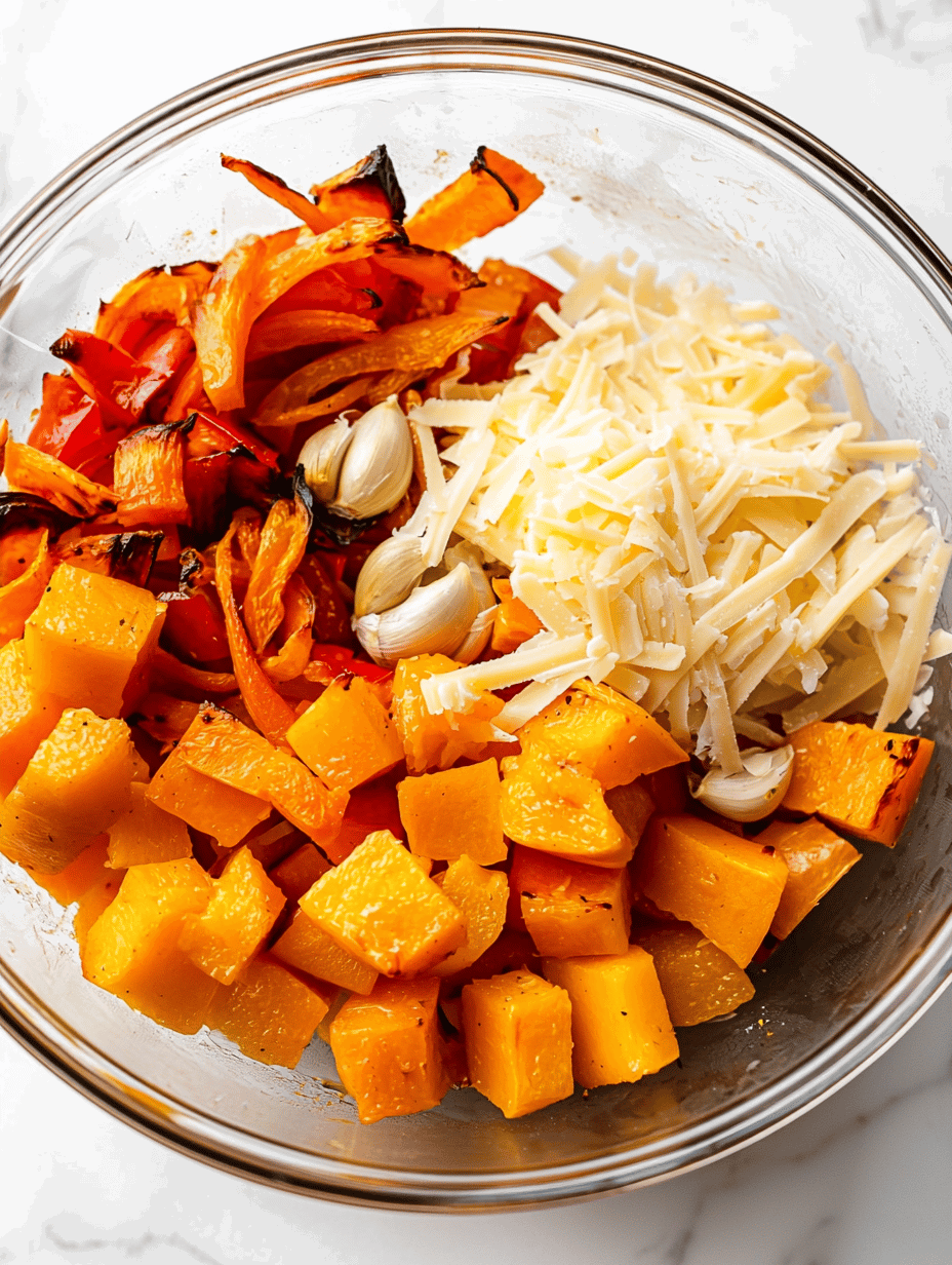- Once the roasted vegetables are done and slightly cooled, gently chop or mash them coarsely in a mixing bowl. Mix in the shredded cheese and adjust seasoning with salt and pepper to taste.
