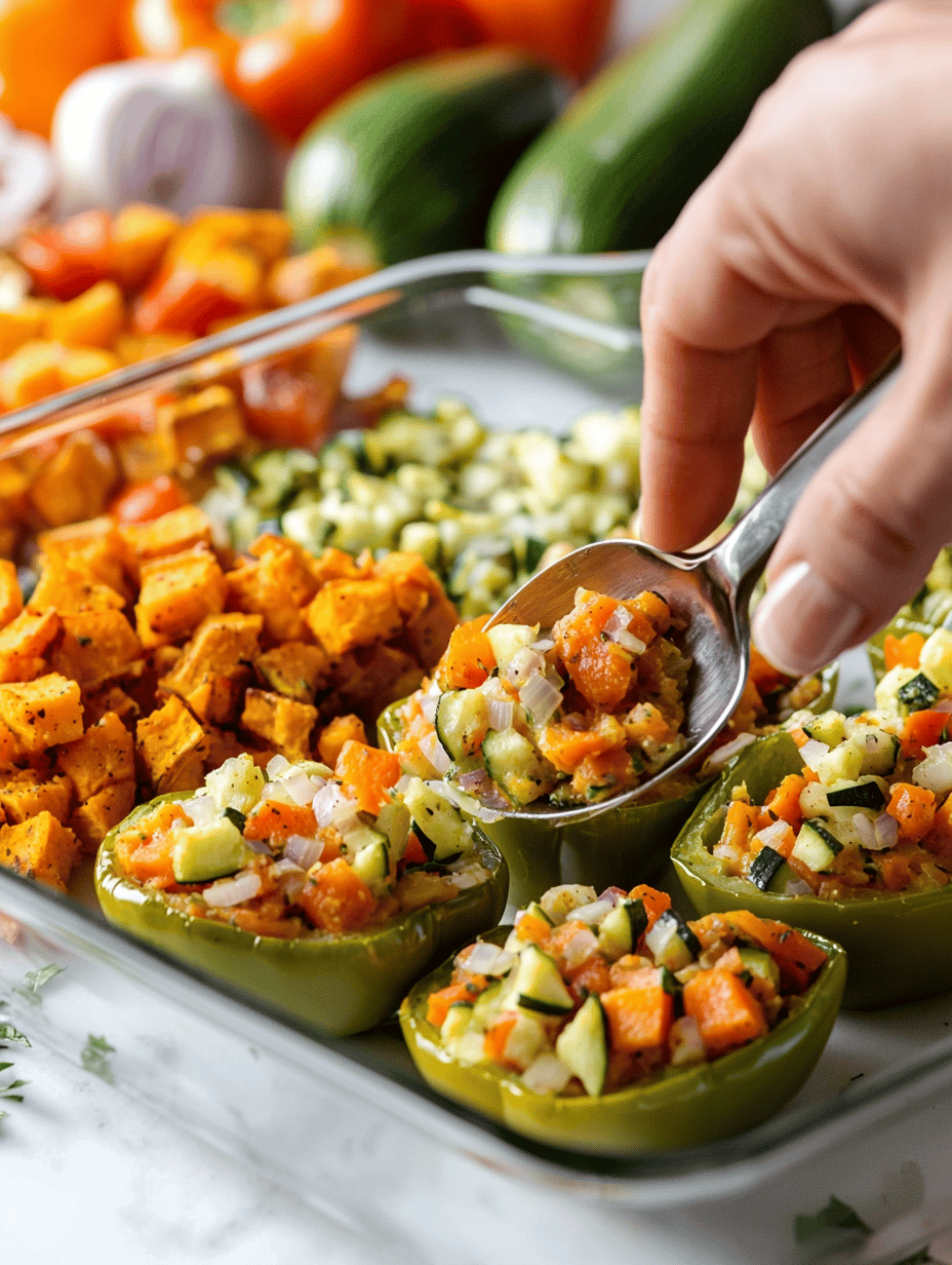 - Spoon the vegetable mixture evenly into each bell pepper half, pressing gently to pack the filling inside.