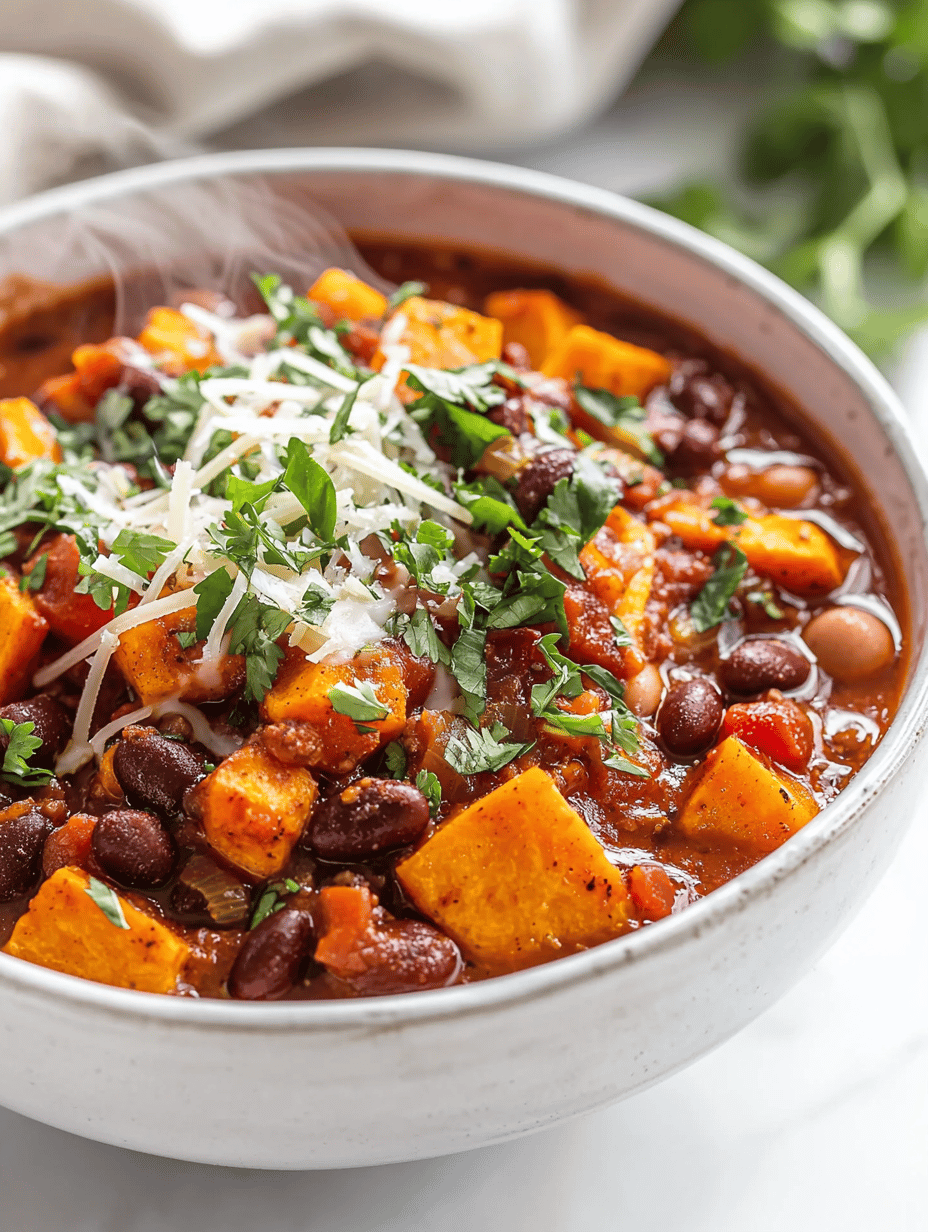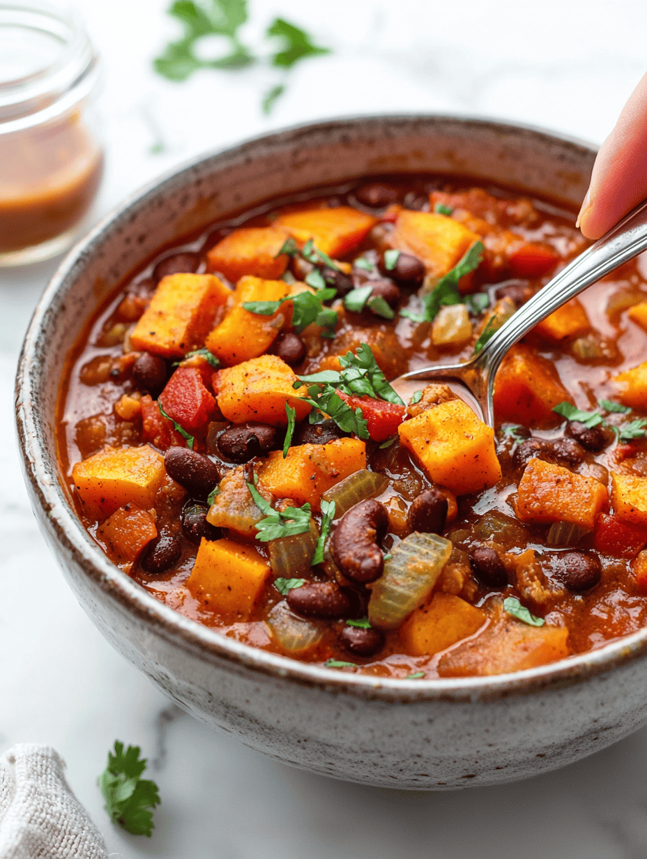 - Serve the chili hot, garnished with fresh herbs or a drizzle of olive oil if desired. The final dish is thick, hearty, with tender sweet potatoes and a robust flavor layered with smoky spices.