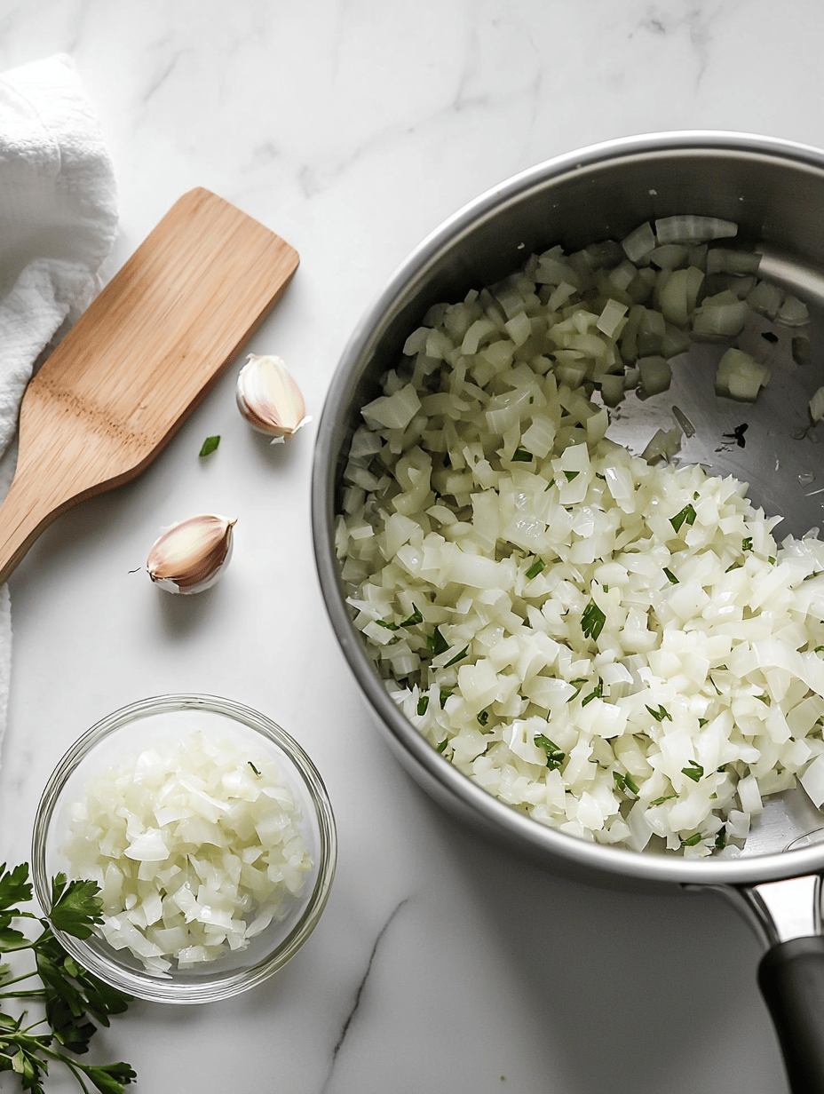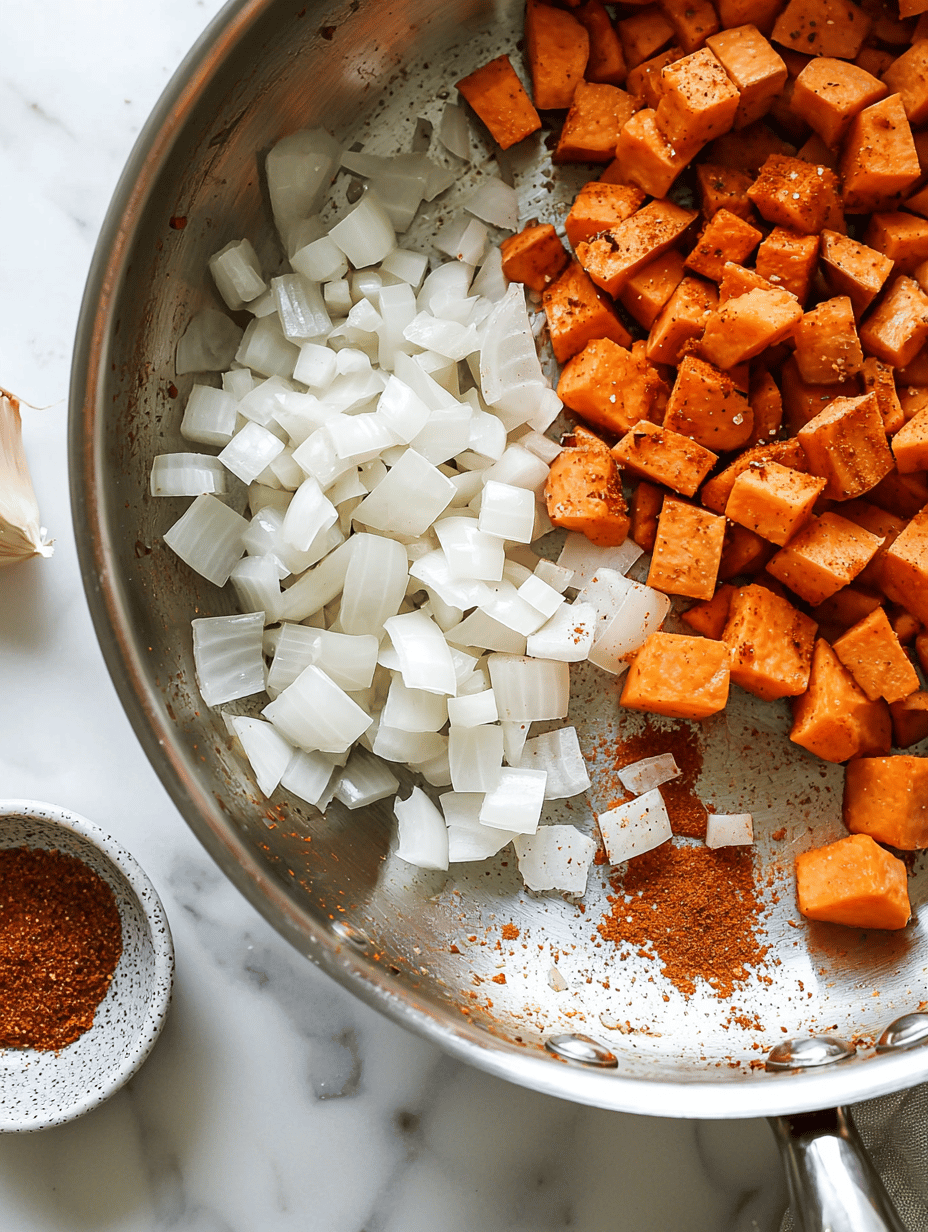 - While the sweet potatoes roast, heat a large pot over medium heat. Add a touch of oil if needed, then sauté the chopped onion until it becomes translucent and soft, about 5 minutes. Stir in the minced garlic and cook for another minute until aromatic.