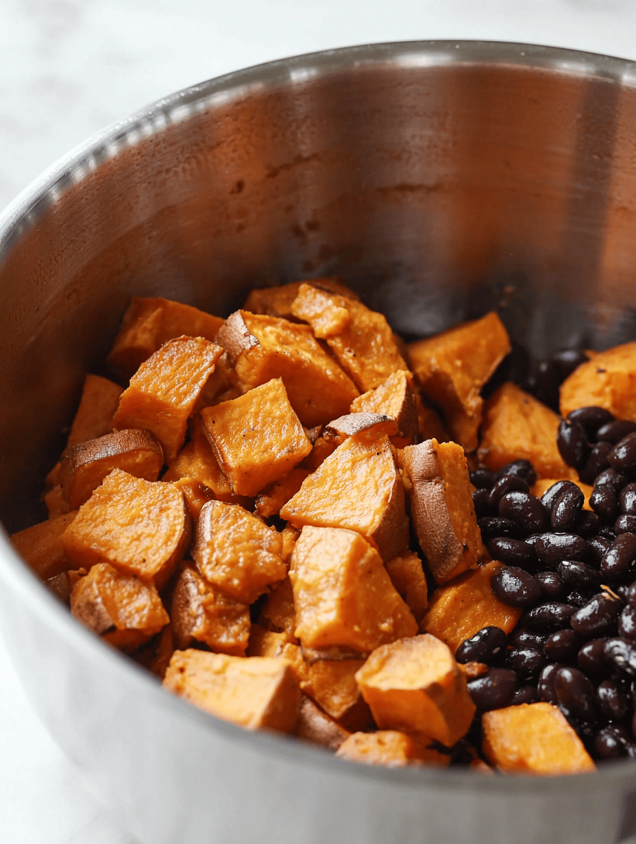 - Add the roasted sweet potatoes to the pot along with the drained black beans. Stir everything together, cover, and let simmer for another 10 minutes to allow the flavors to deepen and the chili to thicken slightly.
