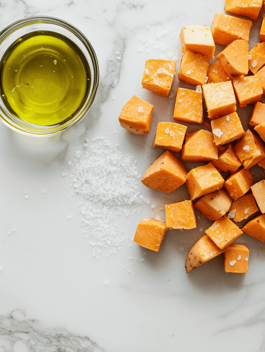 - Preheat your oven to 400°F (200°C). Toss the cubed sweet potatoes with olive oil, sprinkle with a little salt, and spread them in a single layer on a baking sheet. Roast for about 20-25 minutes, until they are tender and slightly caramelized and fragrant.